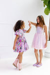 • Dazzling lavender dress covered in vibrant rainbow shooting star sequins that shimmer with every move