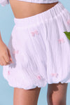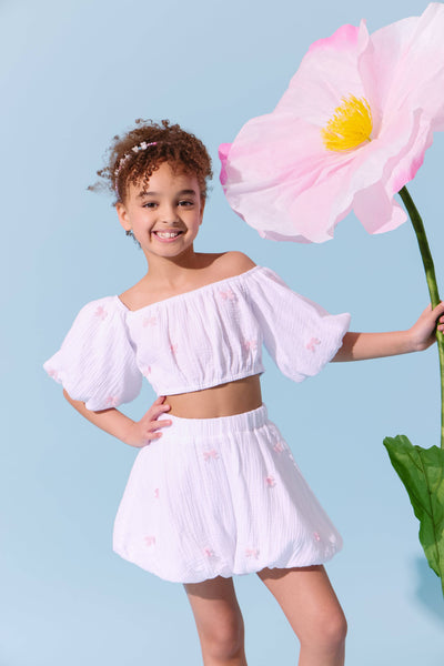 • Exquisite embroidered bows on luxurious, airy muslin fabric for a chic, standout style.