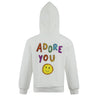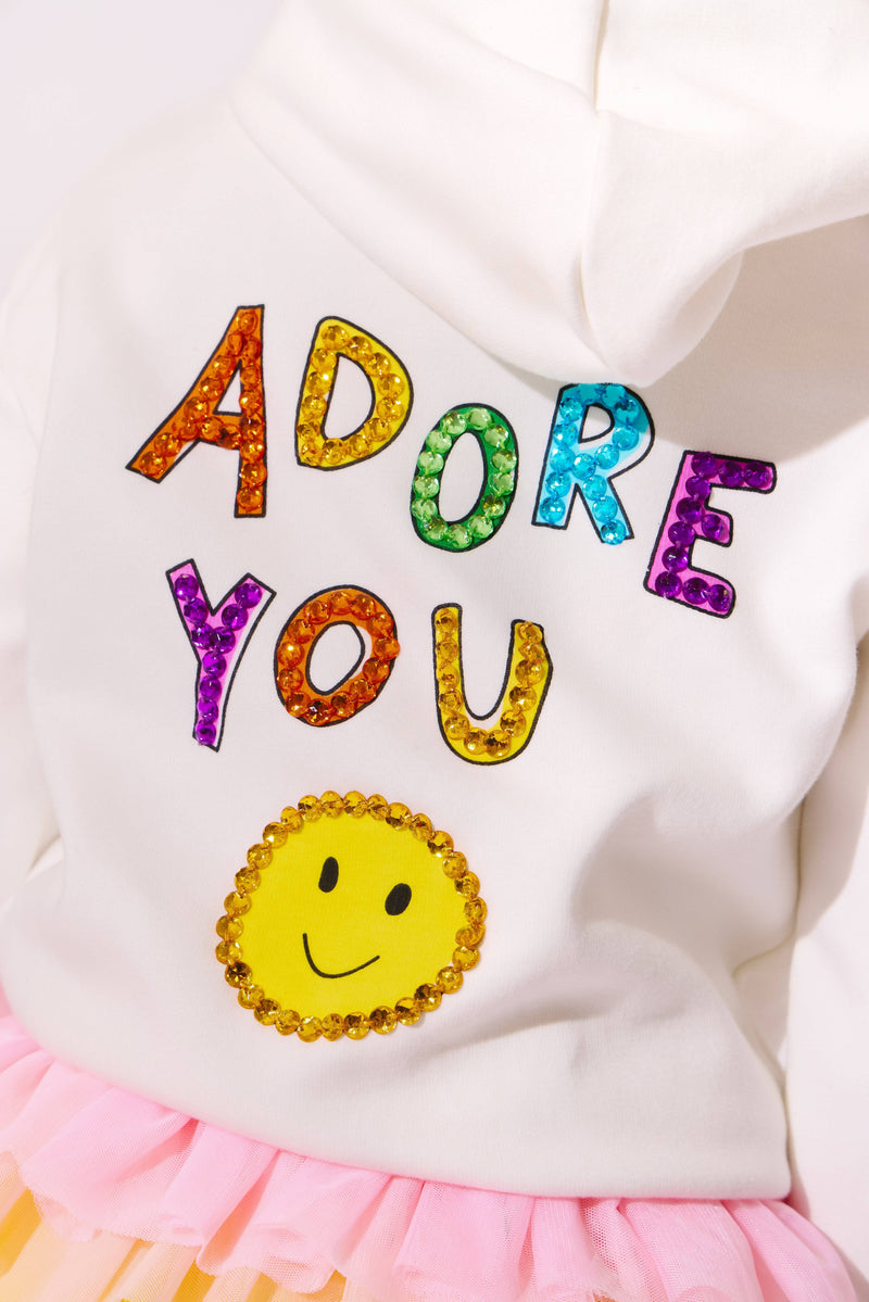 • Statement white hoodie featuring bold, colorful gem-embellished "Adore You" lettering on the back