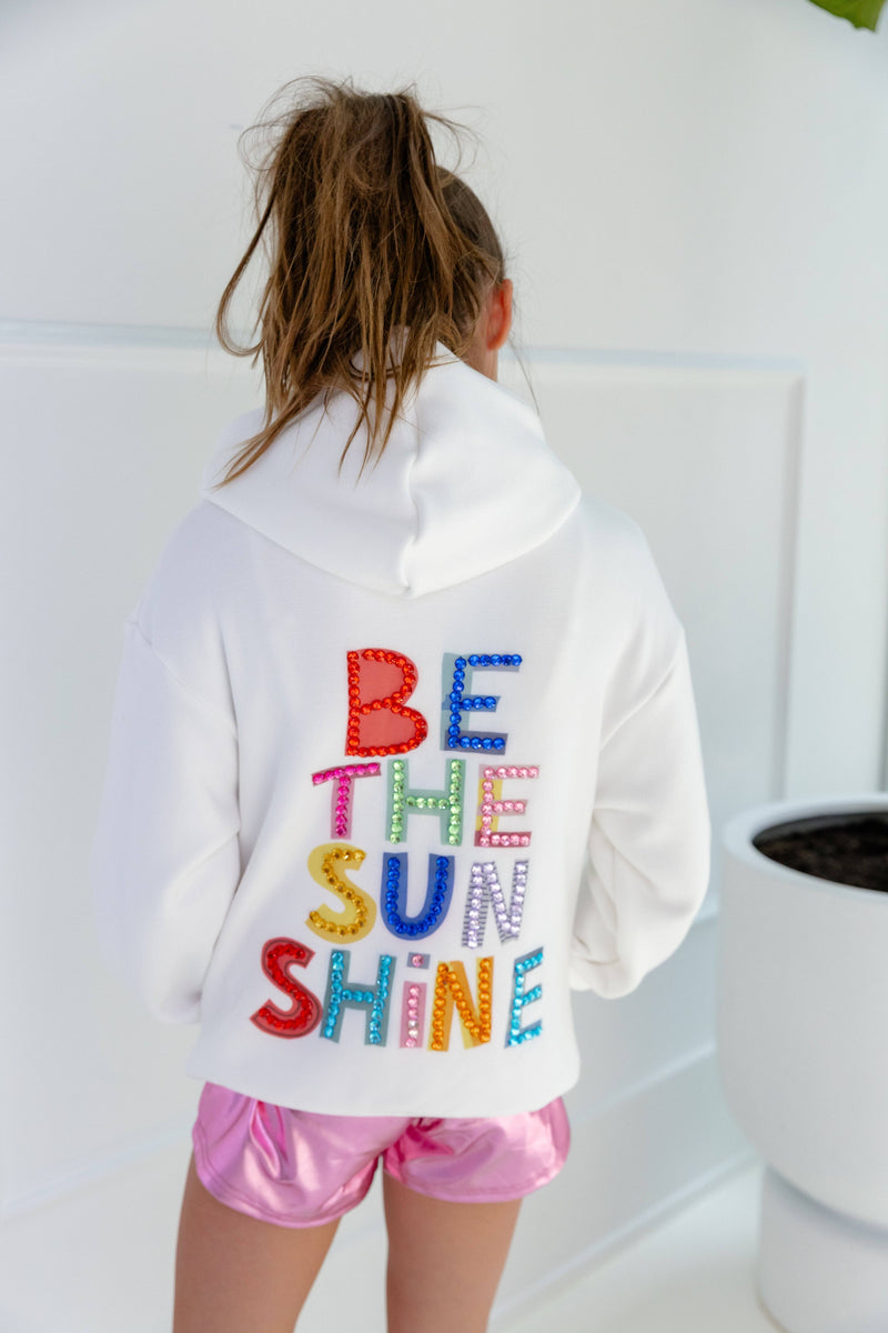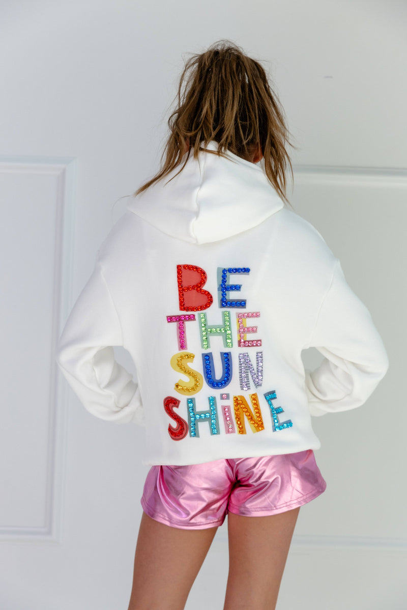 • Radiate positivity with the vibrant "Be The Sunshine" Hoodie, showcasing bold crystal lettering on the back.