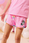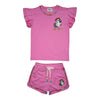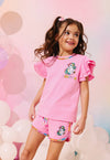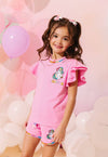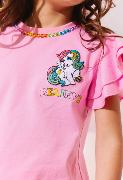• Adorable pink short set featuring a ruffle-sleeve top with a My Little Pony "Believe" patch and sparkling gem neckline