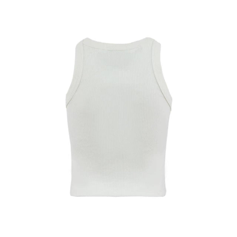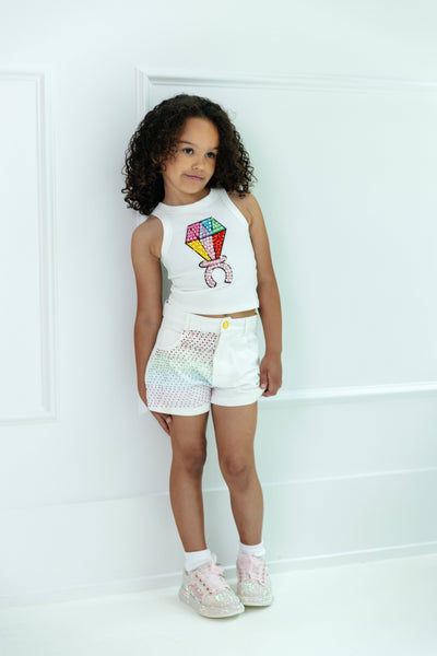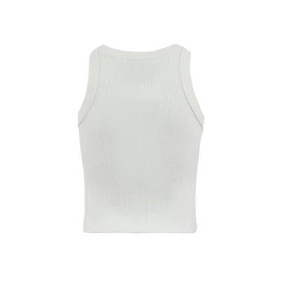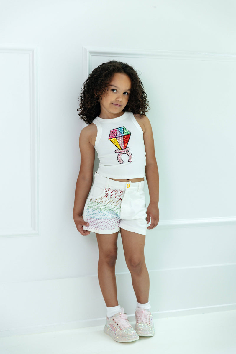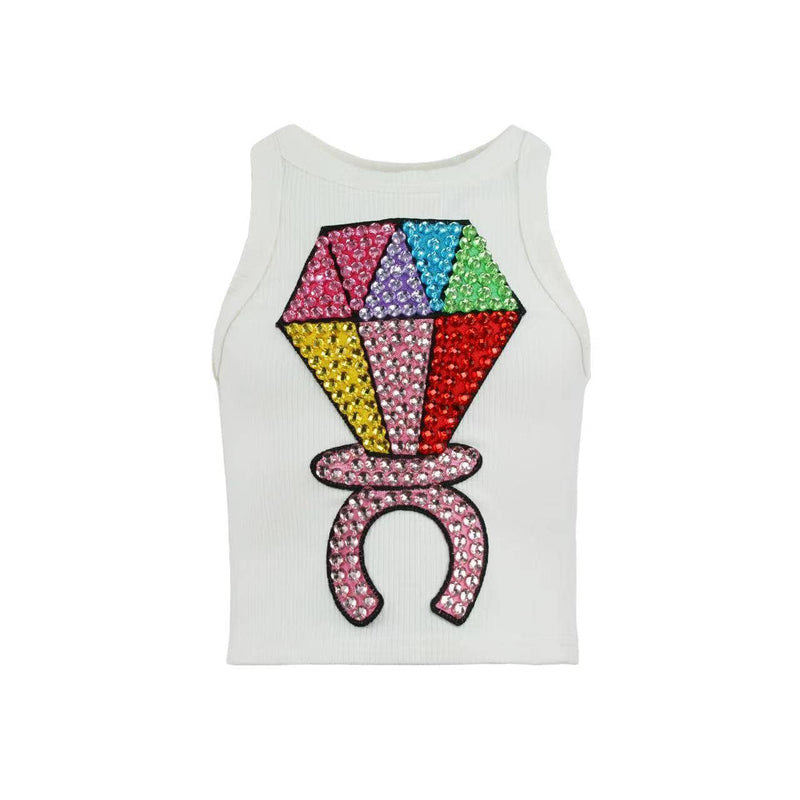 • Sleeveless ribbed tank featuring a colorful candy gem patch at the center