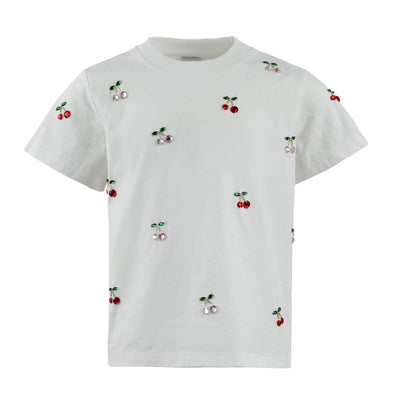 • Bold and playful, this white T-shirt features eye-catching cherry gem embellishments that add a vibrant pop of color and sparkle.