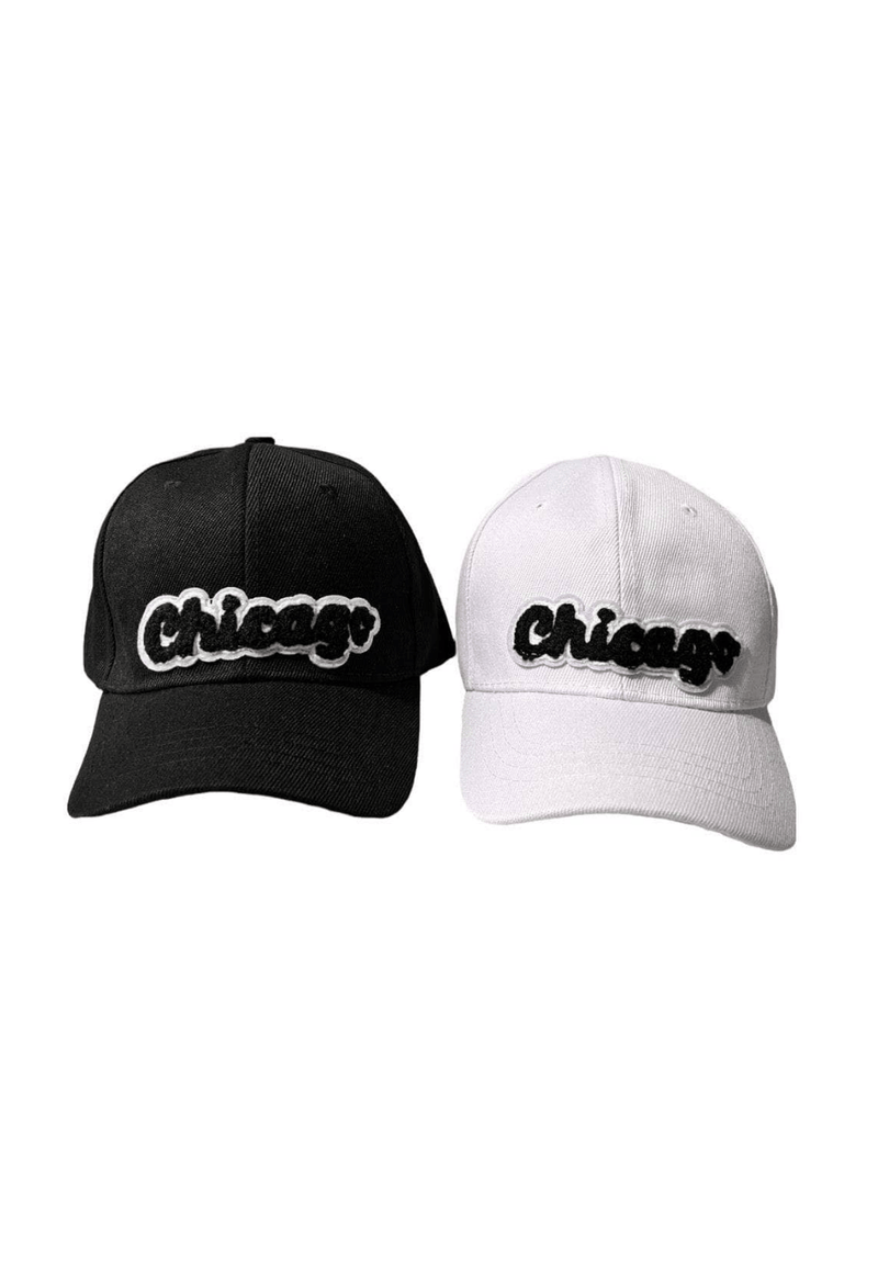 • Classic baseball caps featuring bold “Chicago” patch embroidery in varsity-style font.