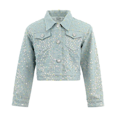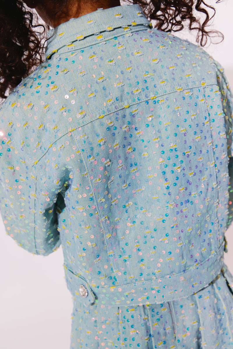 • Light blue denim jacket adorned with colorful iridescent sequins throughout