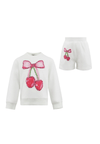 • White short set featuring a vibrant cherry and bow design embellished with sparkling crystals