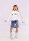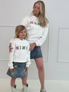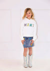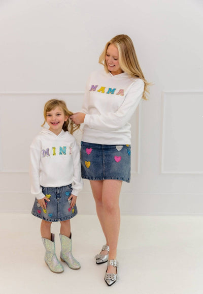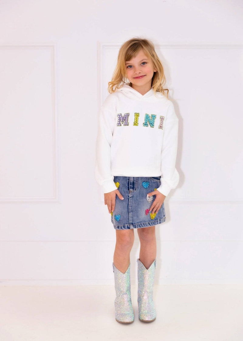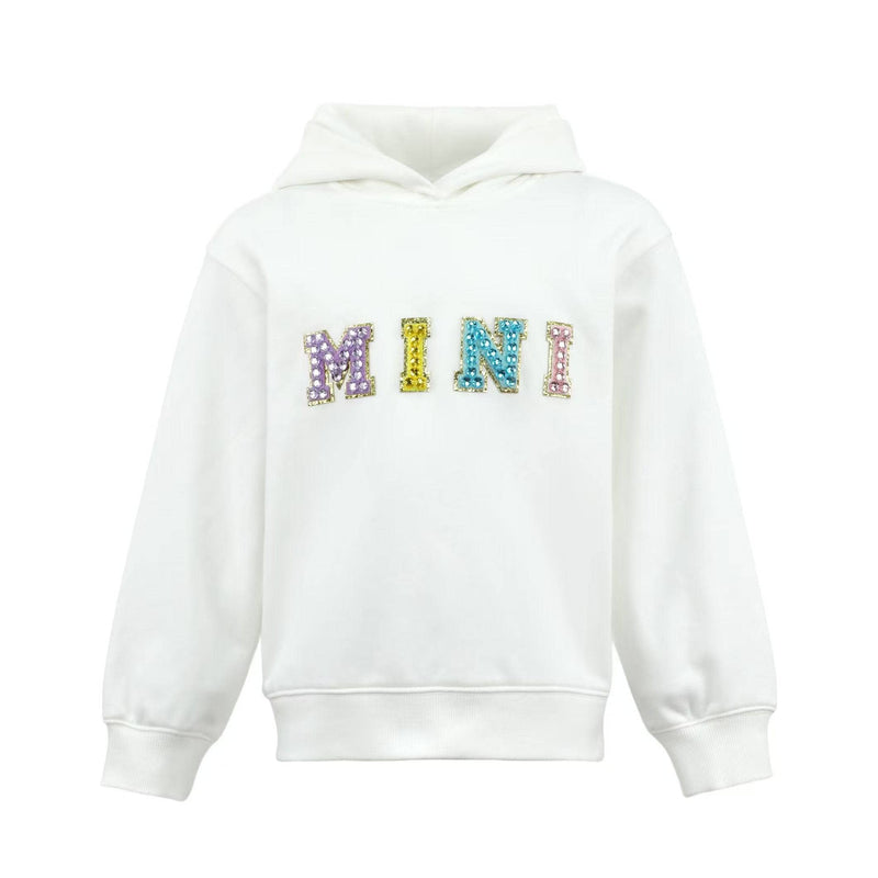 • A delightful white hoodie with "MINI" spelled out in colorful gem-encrusted letters.