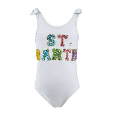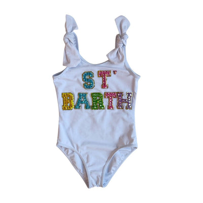 • Chic white one-piece swimsuit featuring colorful gem-studded “ST. BARTH” lettering for a dazzling island vibe
