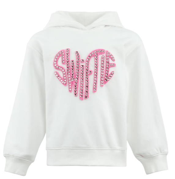 • White hoodie featuring a heart-shaped pink crystal “SWIFTIE” design across the chest
