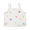 • White lace-trimmed tank top detailed with colorful charm appliqués