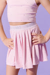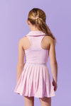 Elevate your style game with the Good Vibes Sparkle Tennis Set, featuring a sleek sleeveless crop top with a stylish collar and matching skirt adorned with shimmering crystal details.