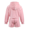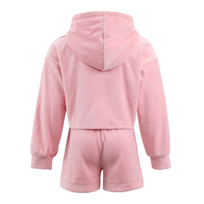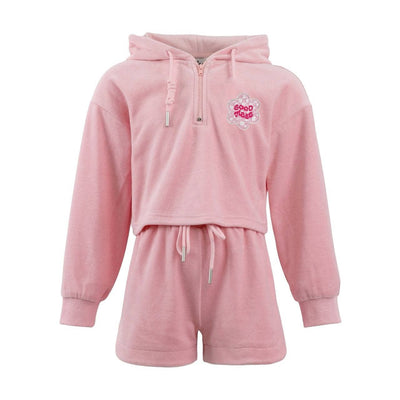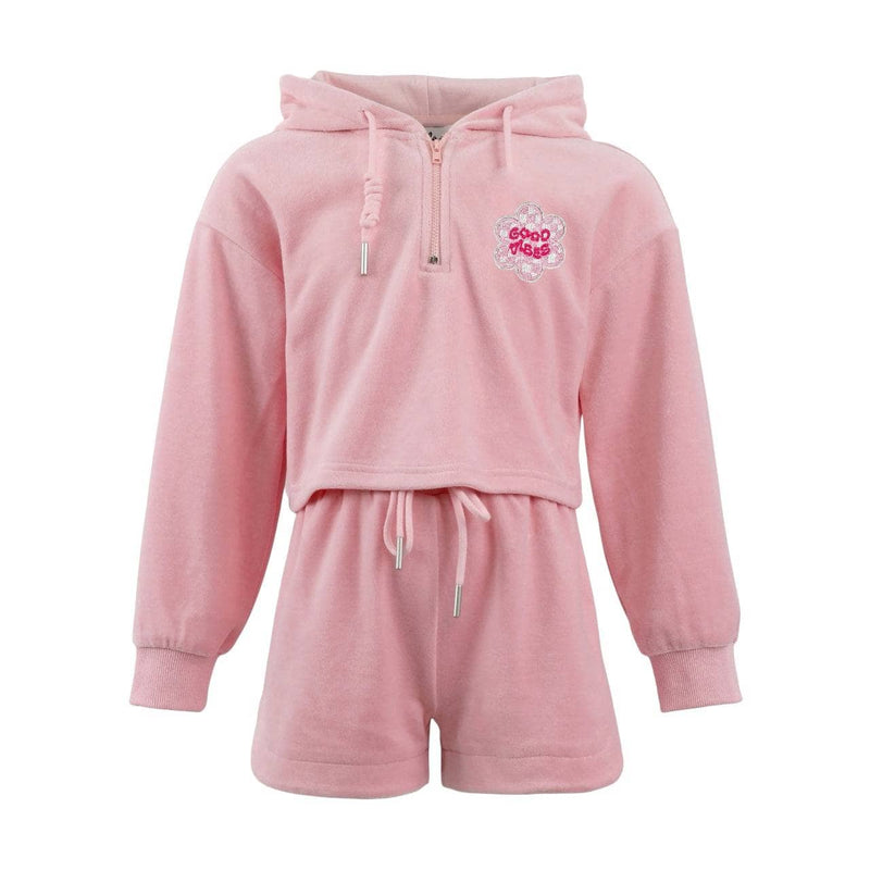 • Soft pink velour set featuring a cropped hoodie with “Good Vibes” sequin patch