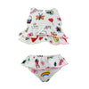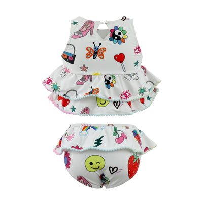 • A fun and playful two-piece bikini featuring colorful doodle-style graphics—from rainbows to butterflies and sweet treats