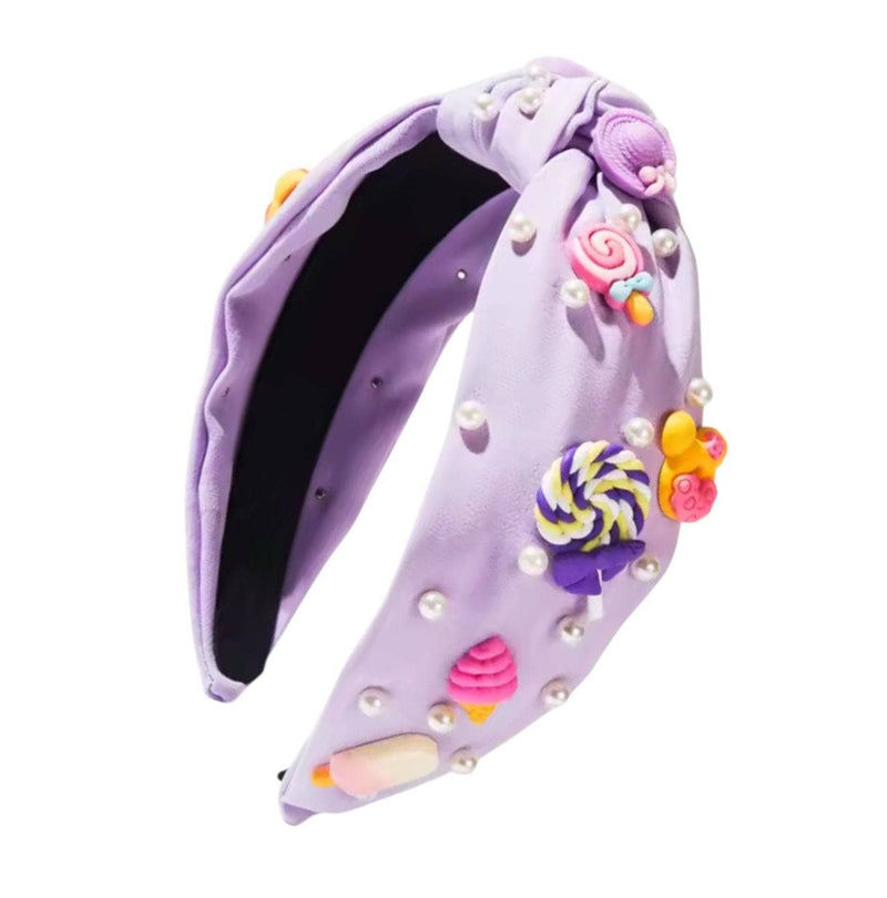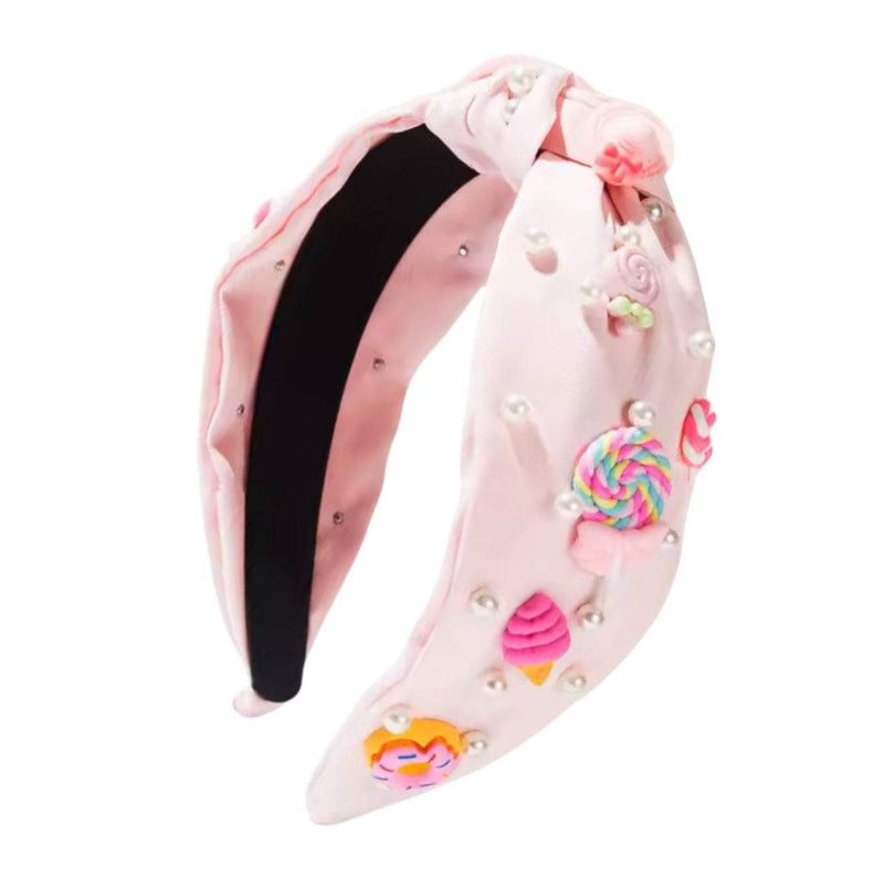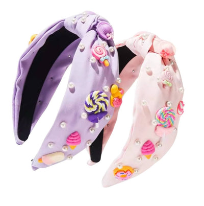 • Material: Fabric-covered headband with resin candy accents and faux pearl detailing.