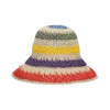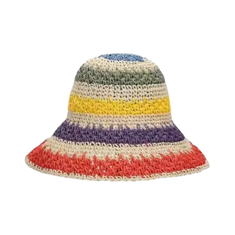 • Hand-crocheted bucket hat with colorful stripes for a playful, sun-ready look.