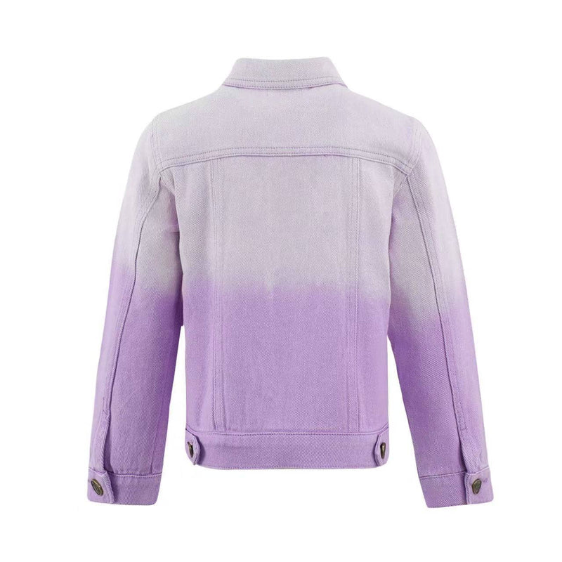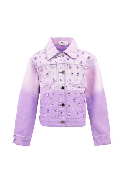 • This ombré lavender denim jacket shines with scattered gem accents that catch the light from every angle.