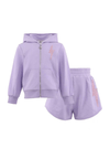 • Lavender zip-up hoodie and shorts set featuring pink rhinestone lightning bolts for standout sparkle.