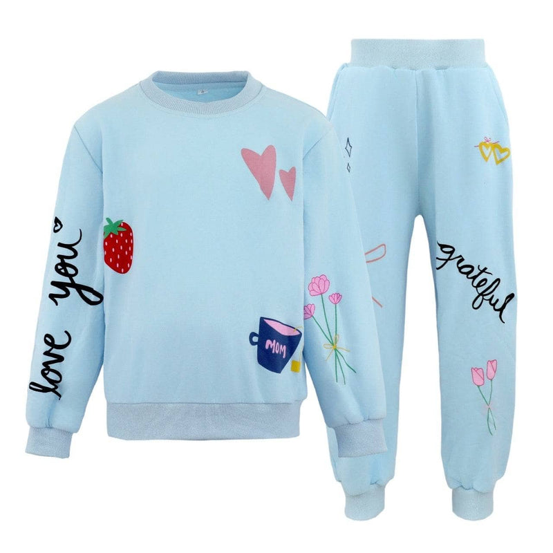 • Features a soft sweatshirt and comfy joggers with playful prints like strawberries, cherries, and hearts