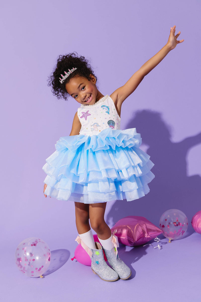 • Sparkling mermaid-themed dress with adorable sea creature embellishments for a magical, ocean-inspired look.