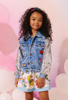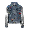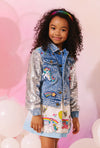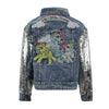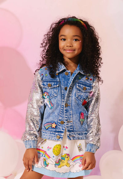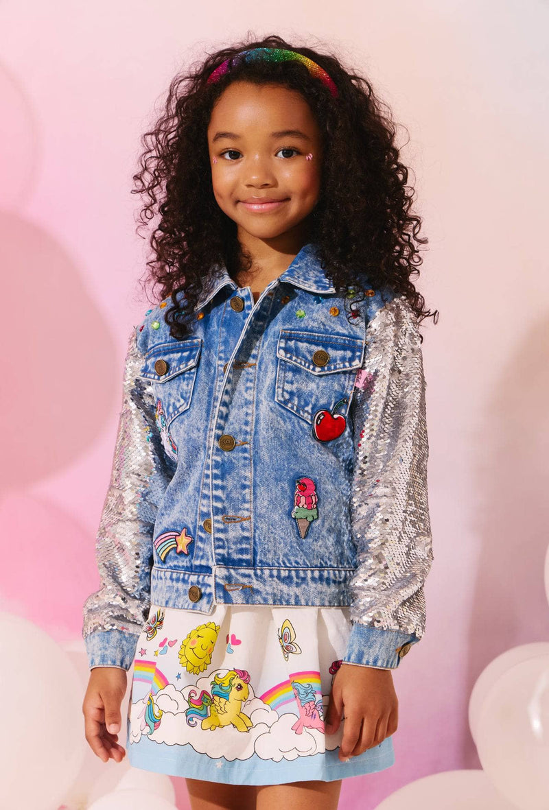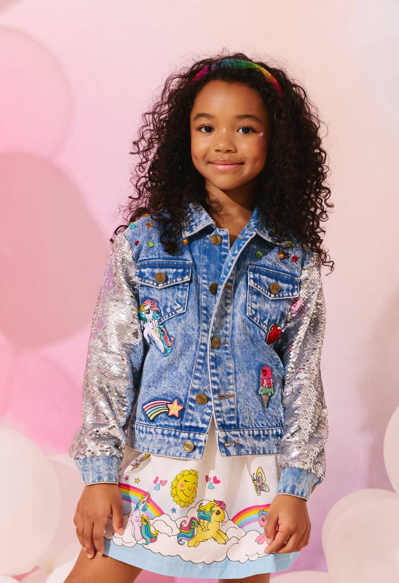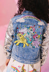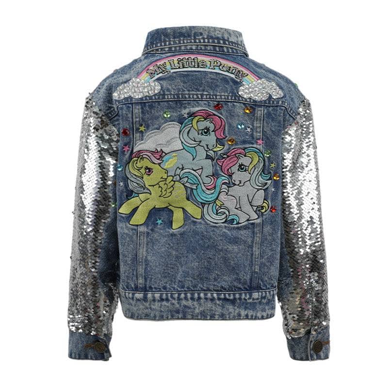 • One-of-a-kind denim jacket featuring colorful My Little Pony patches, sparkling gem embellishments, and shimmering sequin sleeves