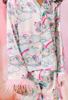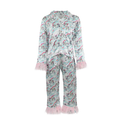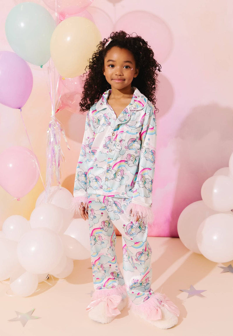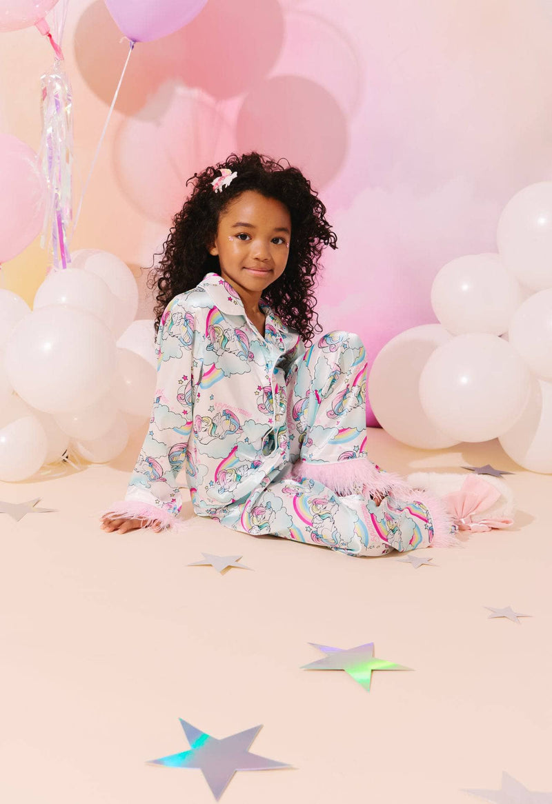 • Luxe My Little Pony silk set featuring an allover pony and rainbow print with glamorous feather trim details