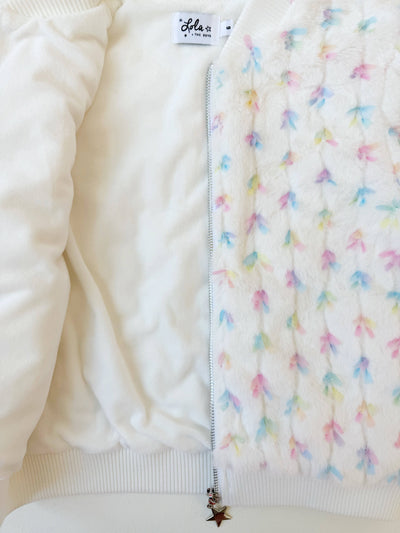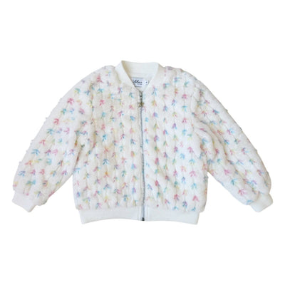 • Adorable fuzzy bomber jacket featuring a soft ivory base with delicate pastel bow accents throughout.