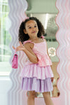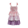 • Stunning ombre shimmer dress with cascading pastel ruffles for a dreamy look.