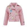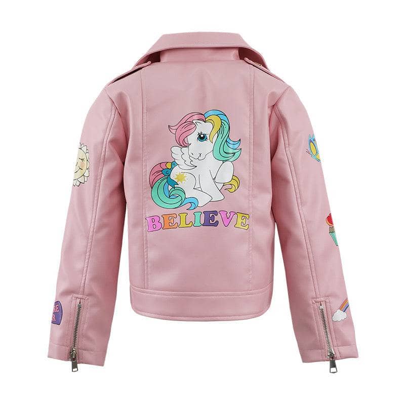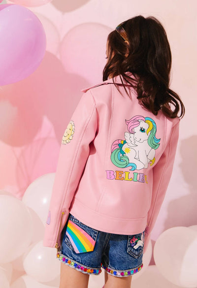 • Trendy pink faux leather moto jacket featuring colorful My Little Pony graphics and playful star and bow accents