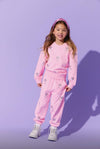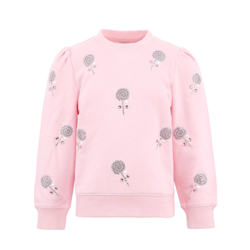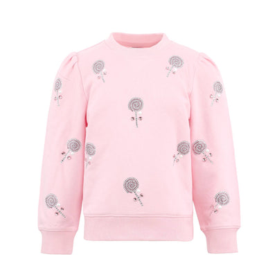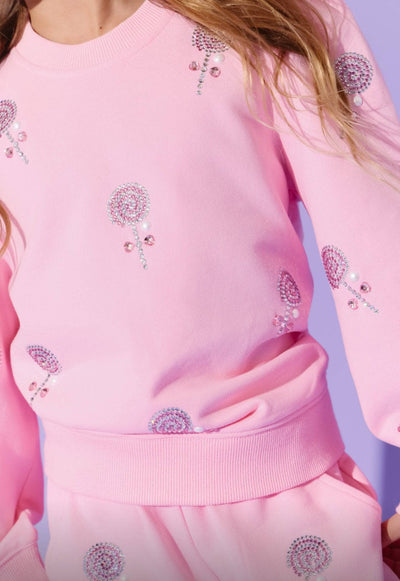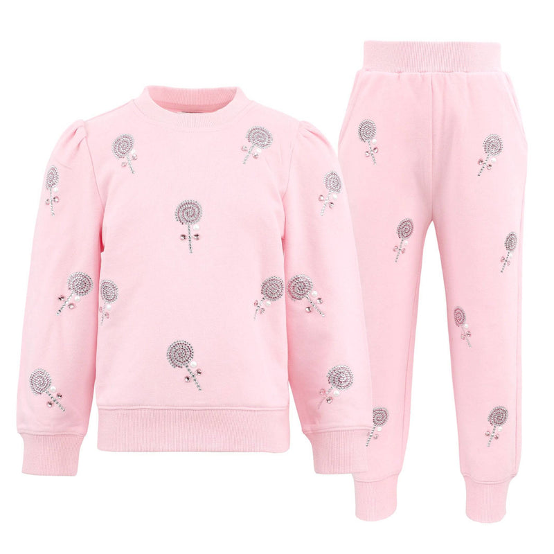 • Adorable pink sweatshirt and jogger set featuring shimmering crystal lollipop embellishments.