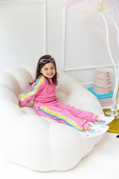 Brighten up any day with this Pink Rainbow Sequin Set, featuring vibrant sequin stripes along the sleeves and pant legs for a fun, eye-catching look.