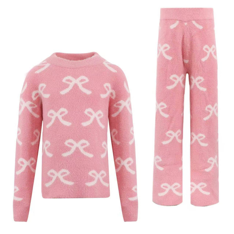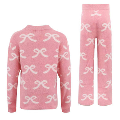 • The Pretty in Bows Fuzzy Set features an all-over white bow print on a charming pink backdrop for a sweet and playful look.