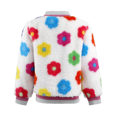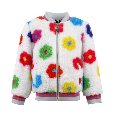 • Add a burst of color to your wardrobe with the Rainbow Daisy Bomber, featuring vibrant floral patterns on a plush textured fabric.