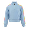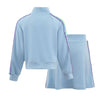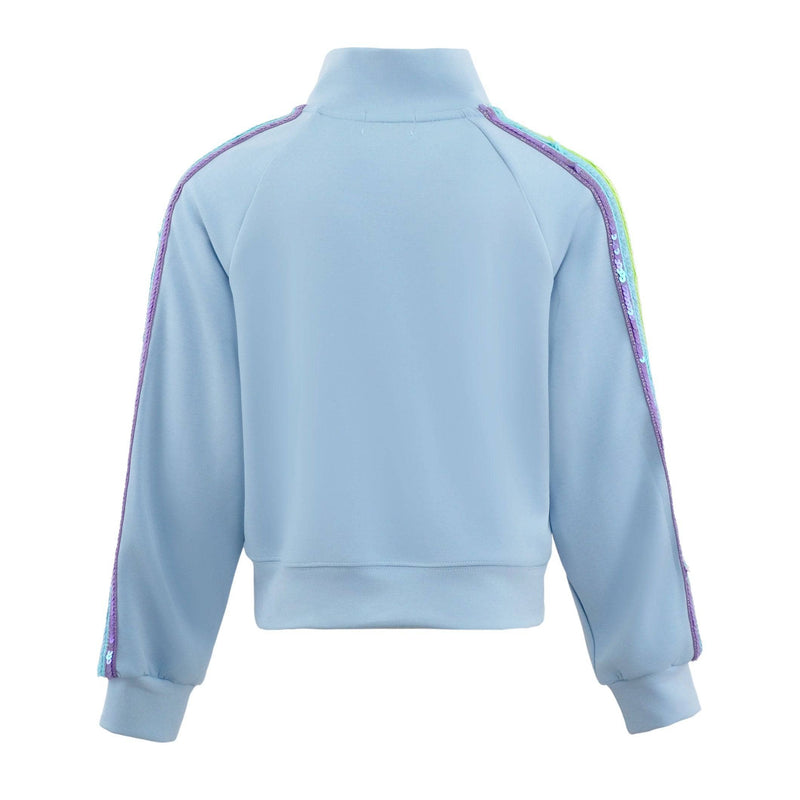 • Two-piece sky blue set with rainbow sequin stripes down the sleeves and skirt sides for extra sparkle.