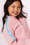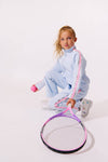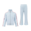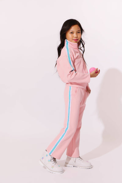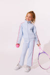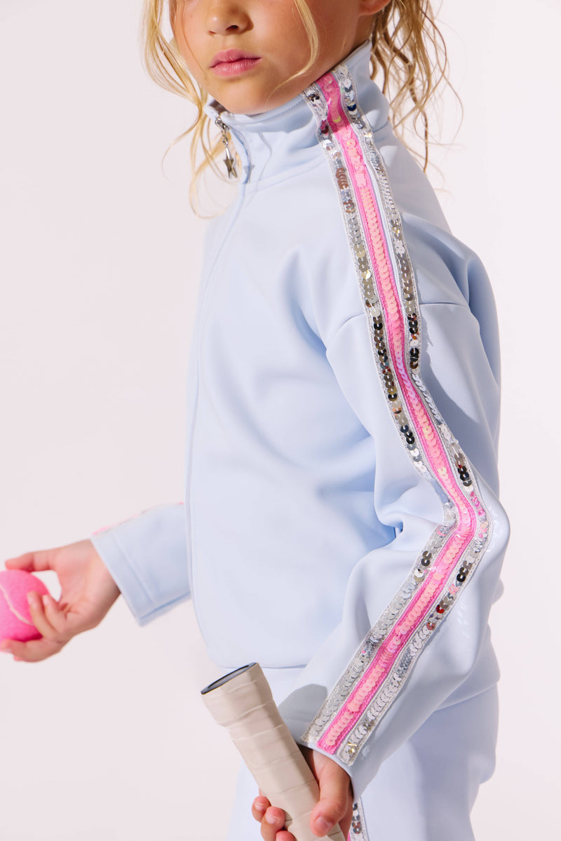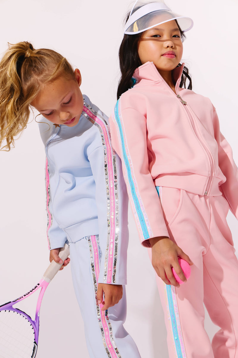• Sleek and sporty tracksuit with shimmering rainbow sequin stripes down the arms and legs