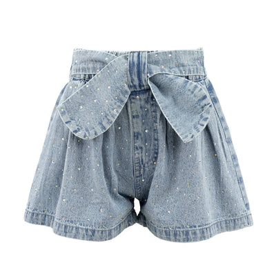 • High-waisted light denim shorts with an attached self-tie bow belt