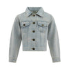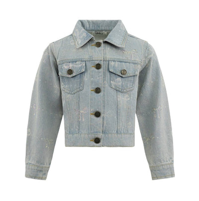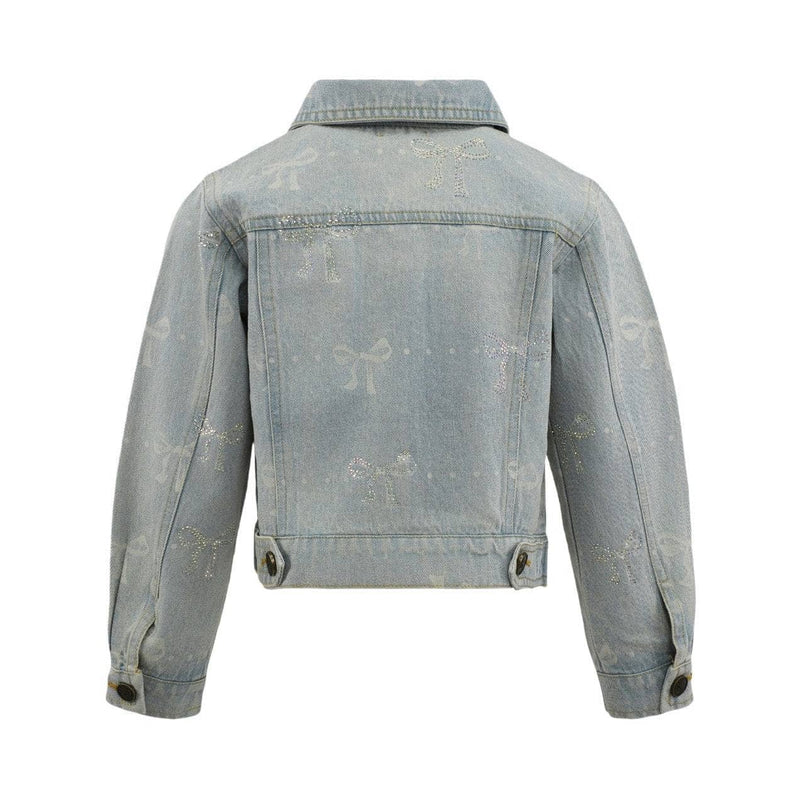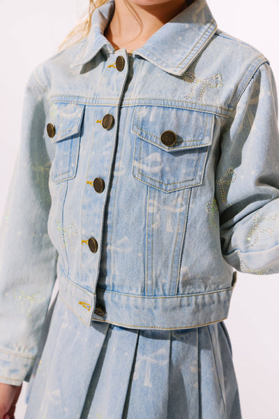 • Light wash denim jacket featuring an allover bow print with sparkling rhinestone accents