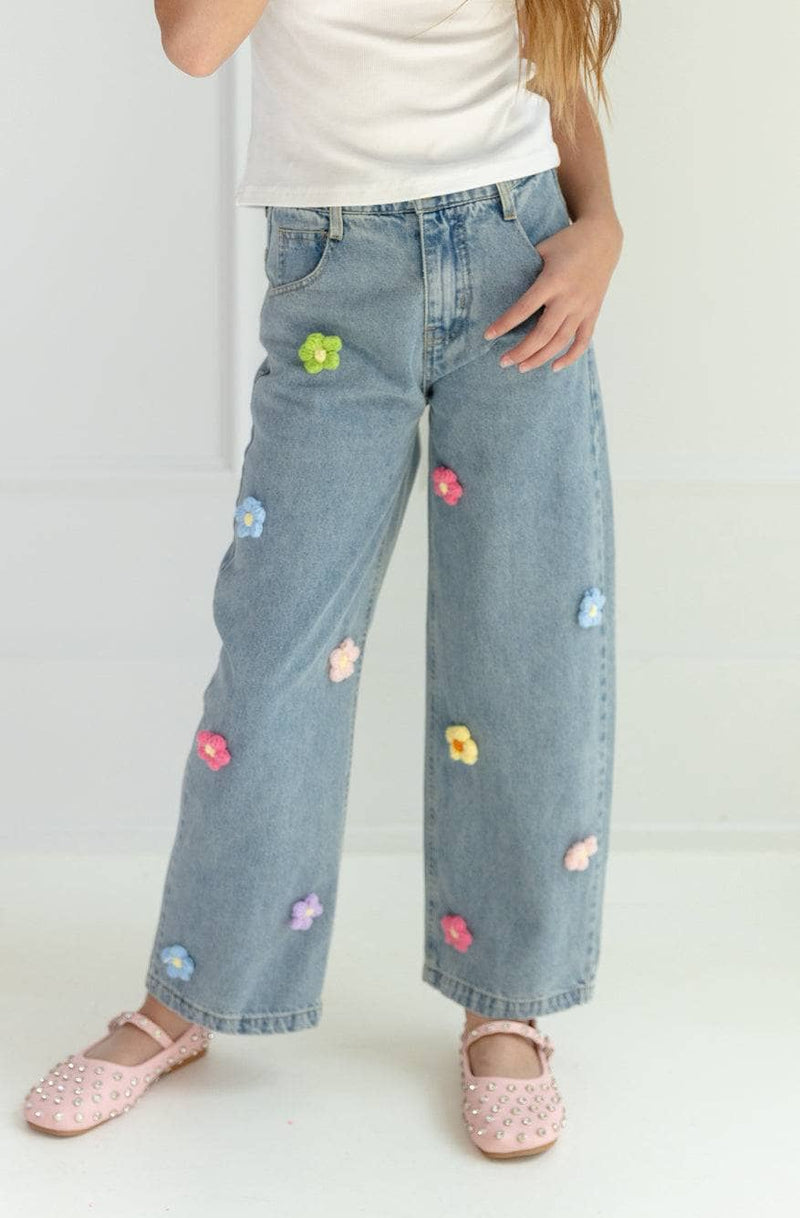 • Classic wide-leg denim jeans decorated with colorful 3D crochet flower appliqués for a standout statement.