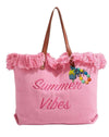 • Pink tote bag with fringe top detailing and “Summer Vibes” embroidered in bold lettering.