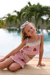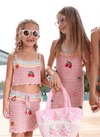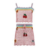 • Adorned with cherry, heart, flower, and rainbow appliqués for a fun, retro-inspired look.