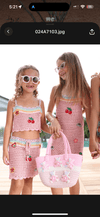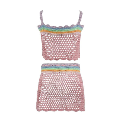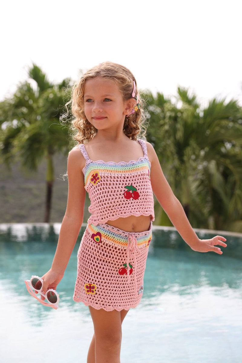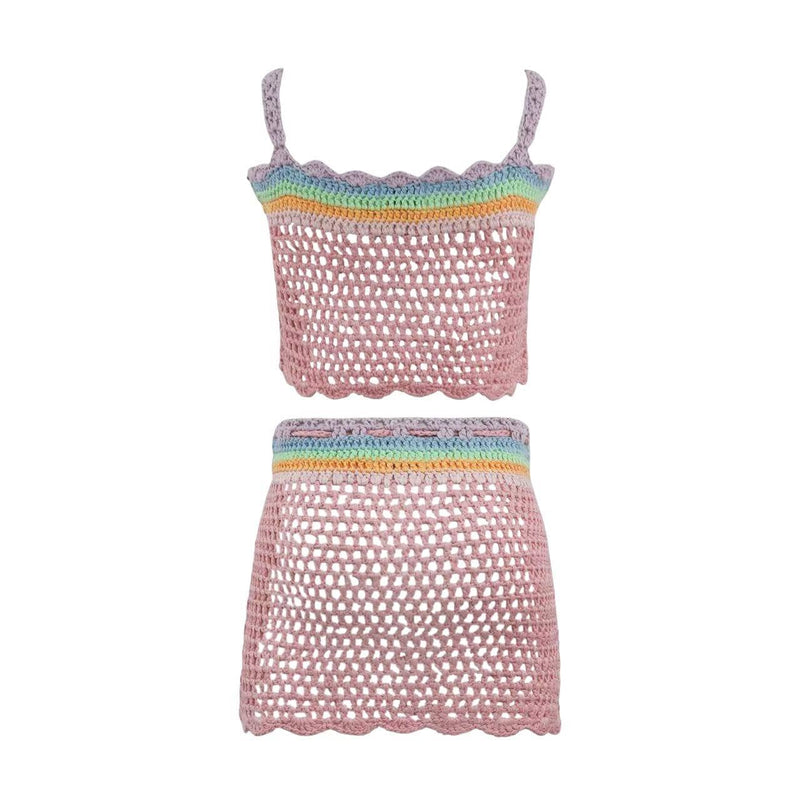 • Two-piece pink crochet set featuring a crop top and drawstring skirt with rainbow trim.