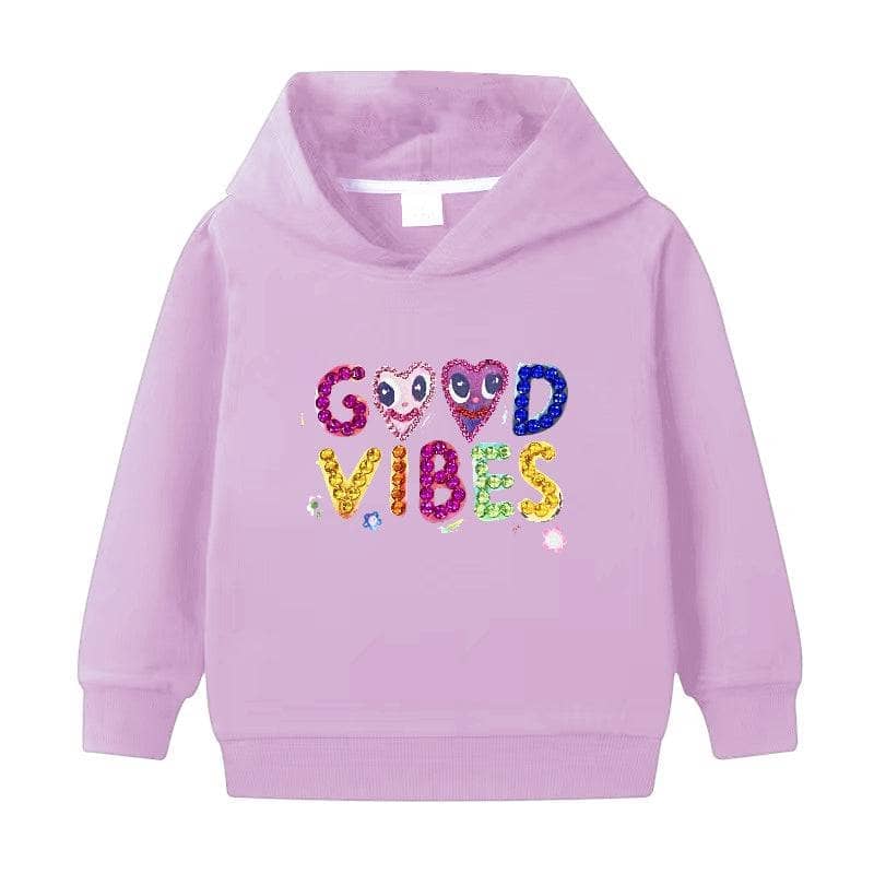 Embellished with colorful "GOOD VIBES" gem letters on the front of the hoodie, adding a sparkling touch that catches the eye and spreads positivity.
