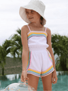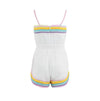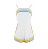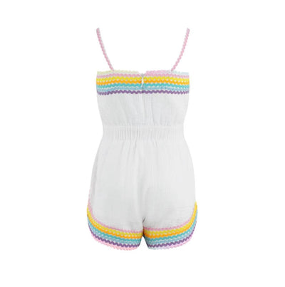 • Lightweight white romper trimmed with vibrant rainbow rickrack along the neckline and hem.