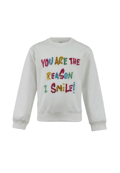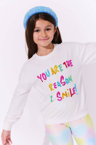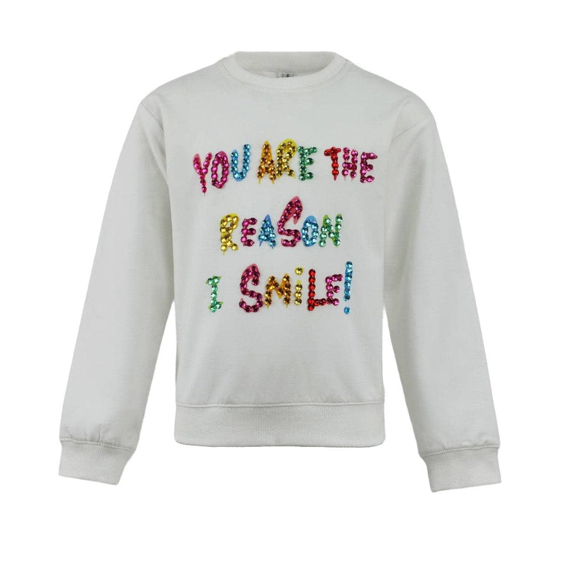 Charming white sweatshirt featuring a vibrant gem-embellished "You Are The Reason I Smile" message.